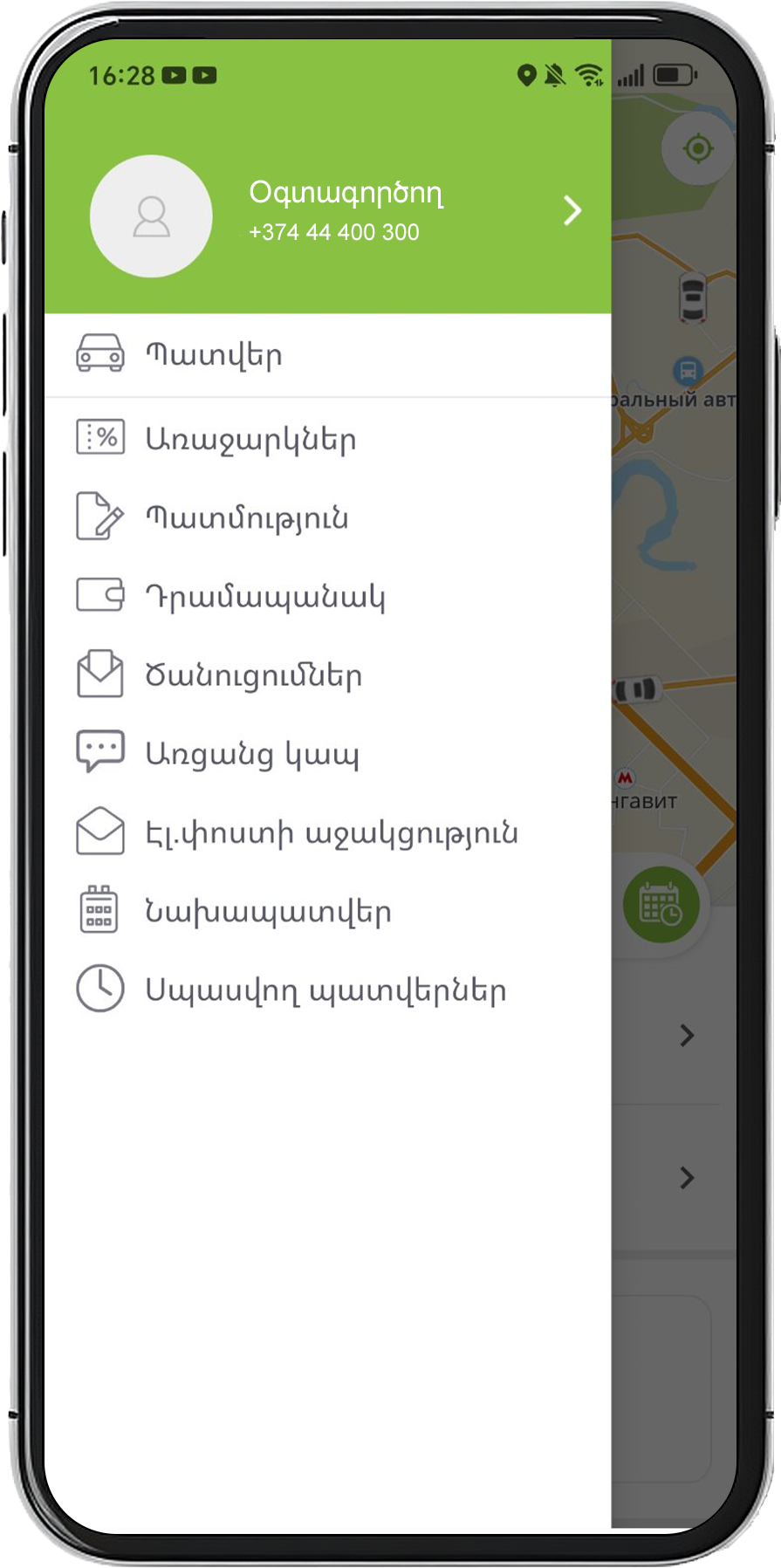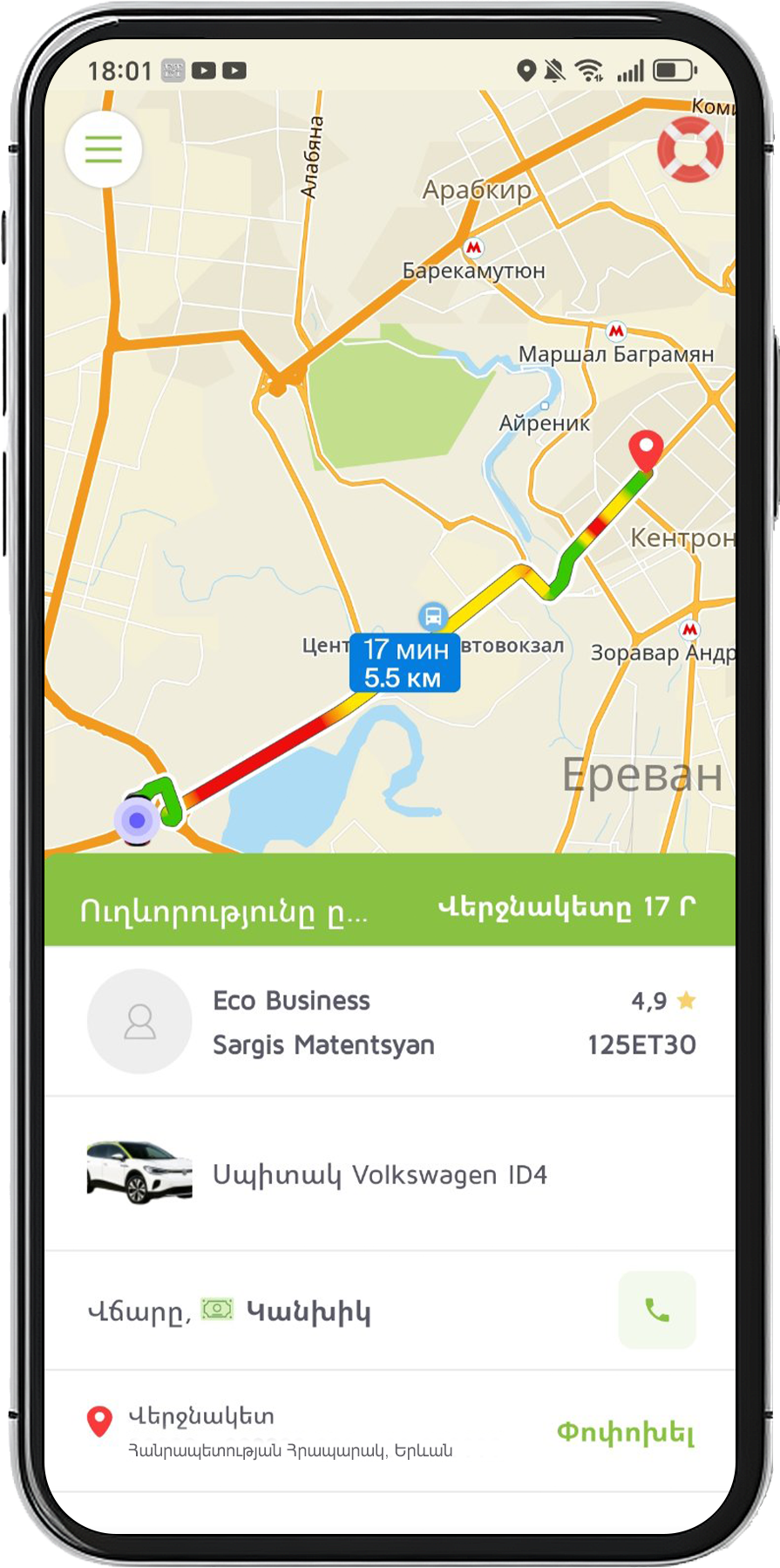 • Վարորդի կողմից պատվերն ընդունելուն պես դուք կտեսնեք մեքենայի դիրքը քարտեզի վրա, ինչպես նաև՝ մեքենայի տվյալները: Կարող եք կապ հաստատել վարորդի հետ՝ առանց Ձեր հեռախոսահամարի իրազեկման:
